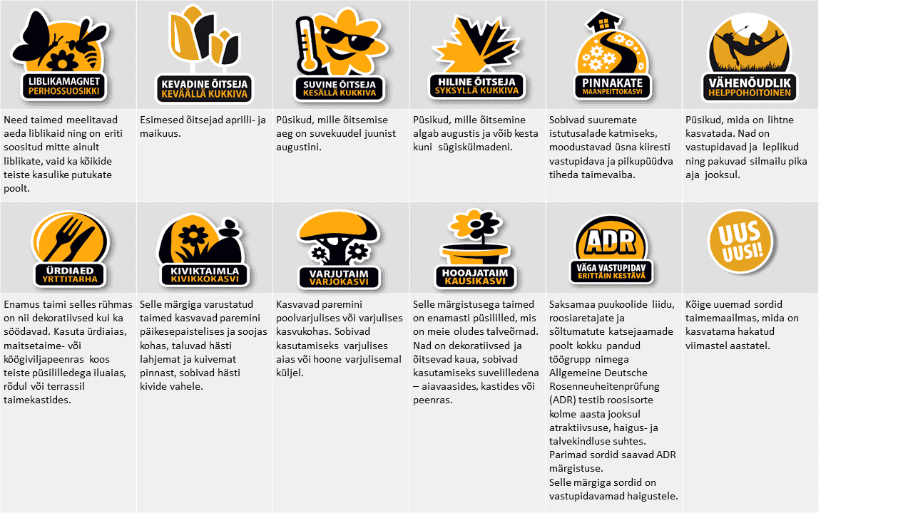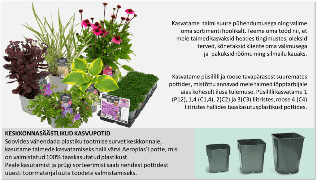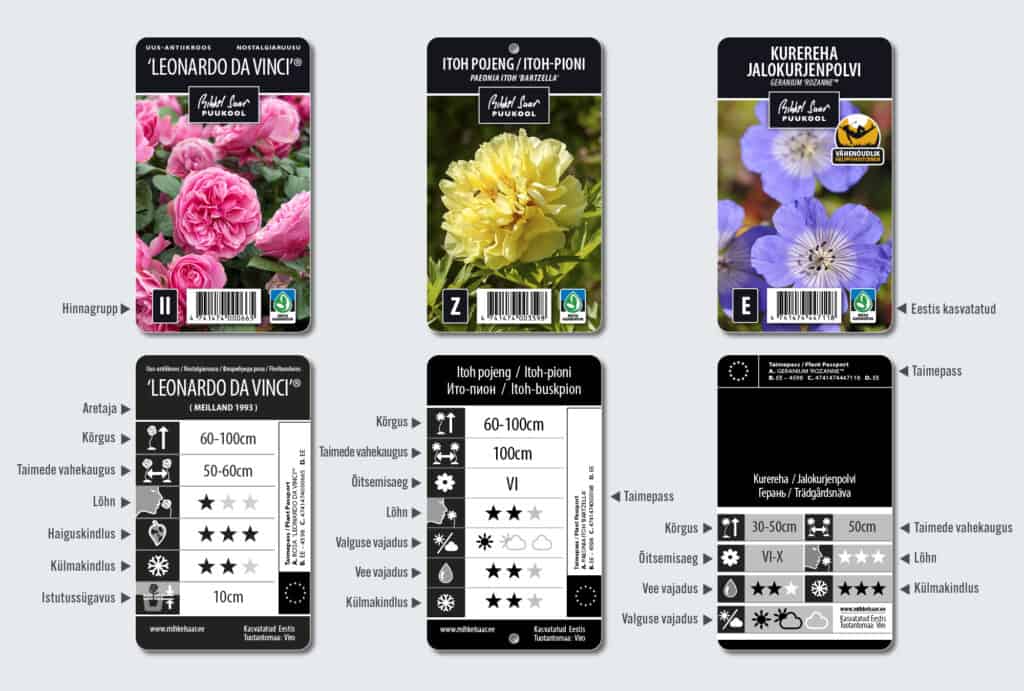 Kõik meie puukoolis kasvatatud taimed on varustatud ilmastikukindlate fotoetikettidega, millel on kirjas taime kasutamist lihtsustav  esmane info:
